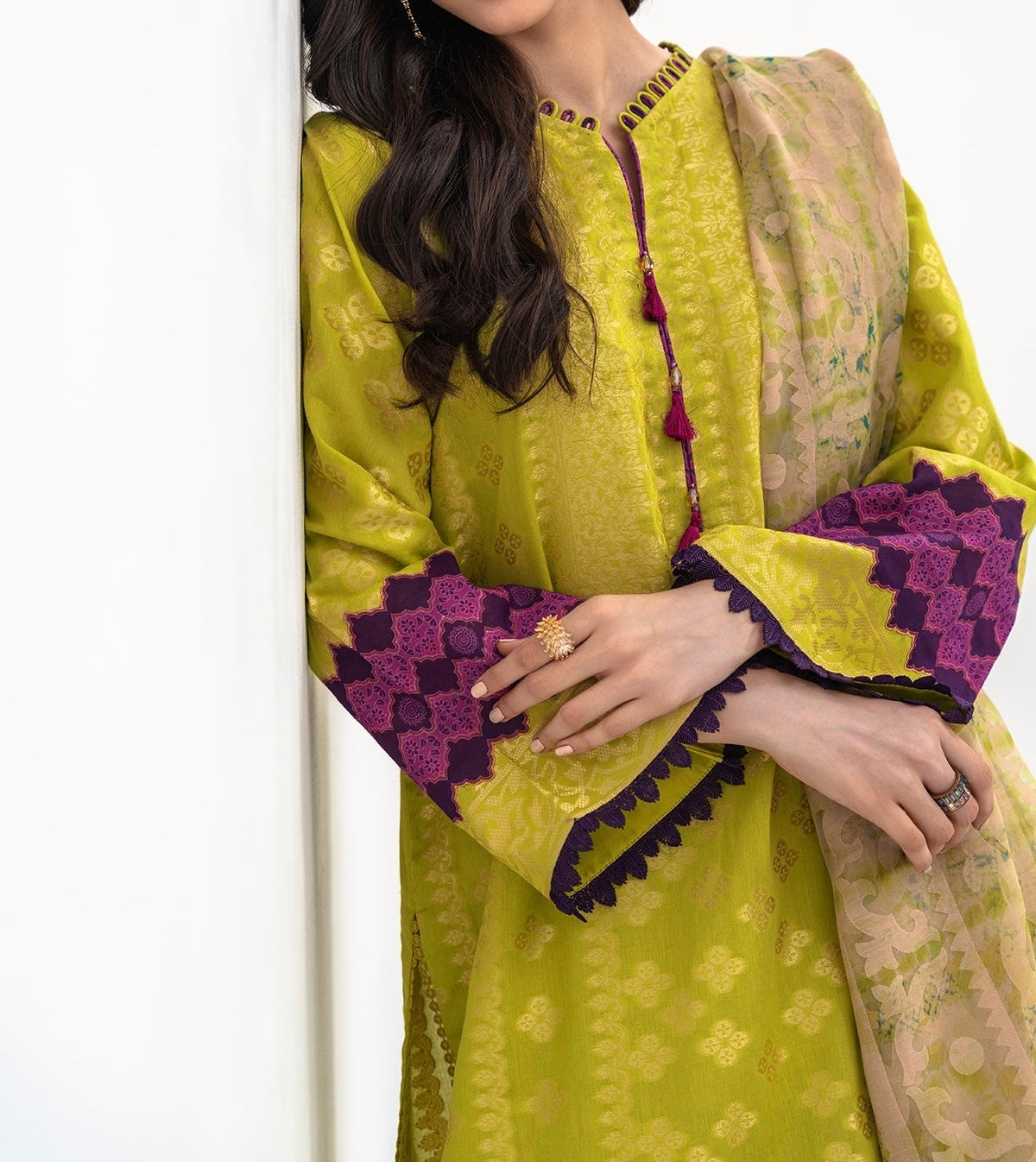 3-PC LAWN JACQUARD SHIRT WITH PRINTED DUPATTA AND TROUSER-CLJ3-01 - Expertly crafted with a mix of lawn fabric and jacquard, this 3-piece set exudes elegance. The cotton trousers add comfort, while the burnout dupatta completes the look. A must-have for any stylish wardrobe.