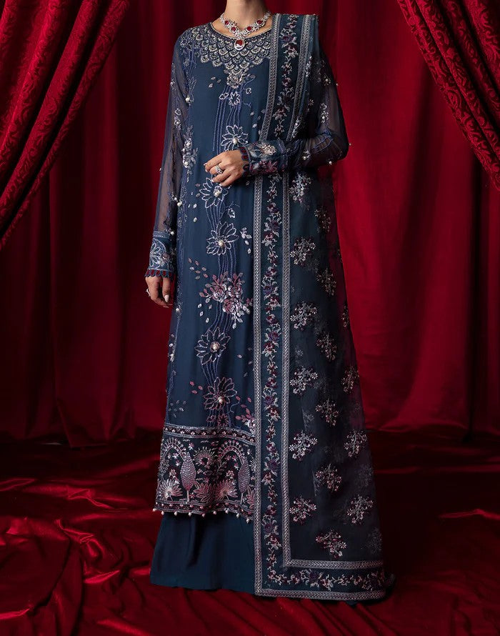 Indulge in the opulent embroidery of chiffon and organza with hand embellishments adorning the front and back. Intricate organza neck patches enhance the sophistication, while embroidered organza borders and sleeves with silk borders exude elegance. The luxurious silk dupatta panels and borders, paired with a plain raw silk trouser and inner, complete this exquisite ensemble.