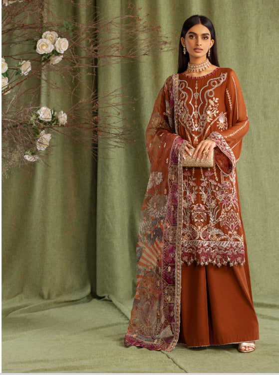 The mesmerizing rust color showcases intricate self-embroidered patterns embellished with delicate threads and shimmering sequins. This meticulous detailing adds a captivating sparkle to the dress, ensuring that it exudes the perfect look befitting your style.