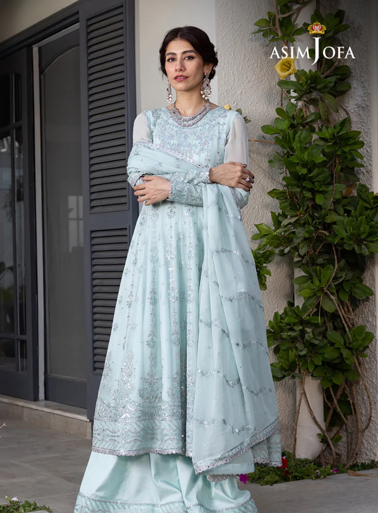 In the serene shade of dusty mint, this ensemble from Asim Jofa’s ‘MERA HASEEN JORA’ collection exudes an aura of calm that's both effortless and eye-catching. Dazzling sequin, lurex, zari, and thread work embellish the kalidaar and dhaka pajama while the dupatta adds a touch of ethereal charm. A masterpiece that balances traditional aesthetics and contemporary sophistication.