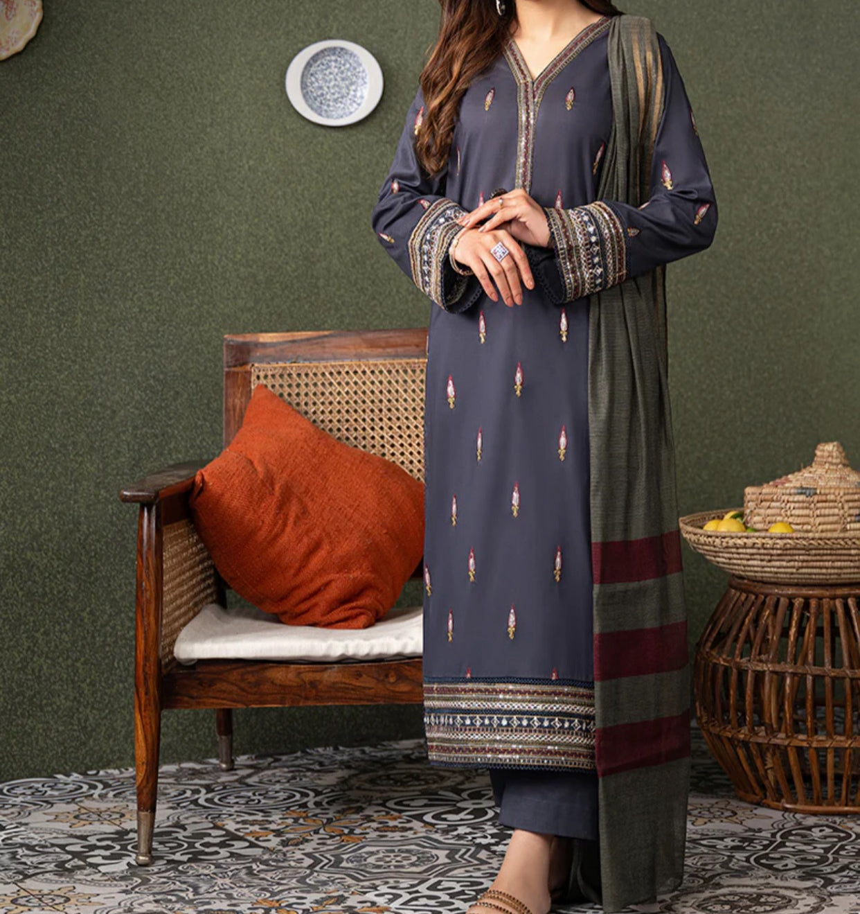 Step into refined elegance with an embroidered dark blue ensemble paired with a dupatta – a trio that combines comfort with timeless charm.