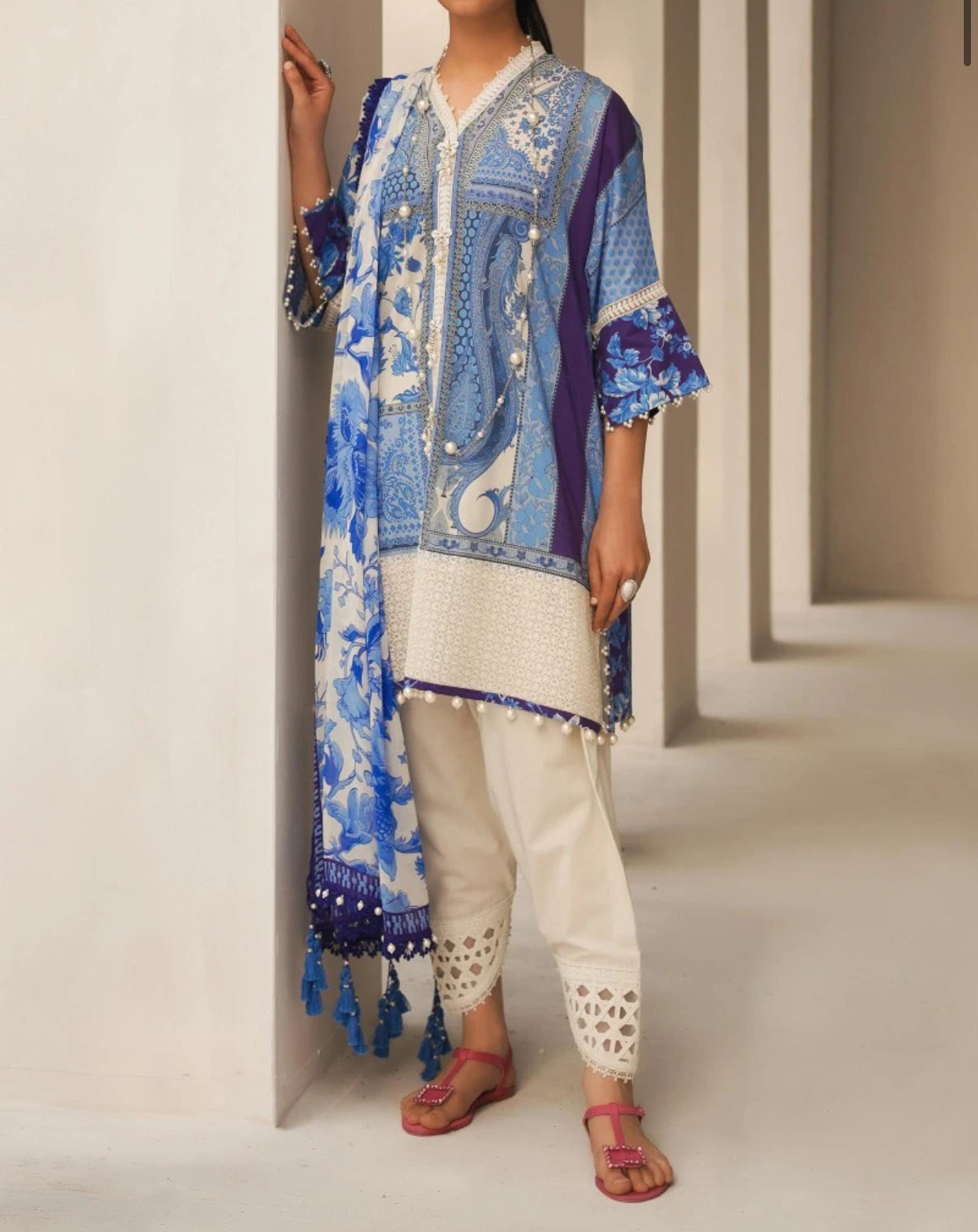 dupatta with chintz flowers and cream pants, echoing a hum of lush gardens.