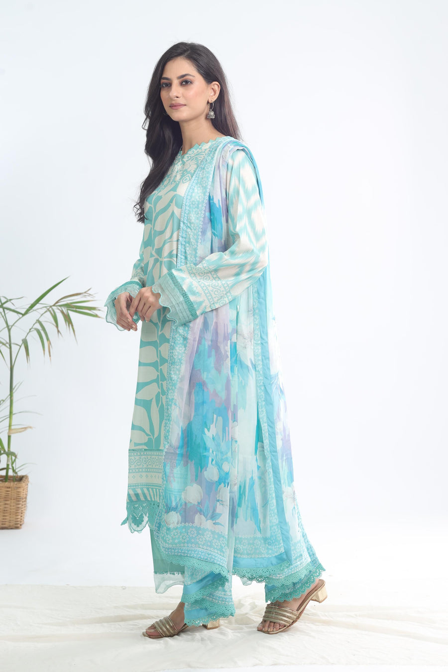 Elevate your summer style with this elegant pastel sea green ensemble from Nureh’s Signature Collection. Crafted from premium lawn fabric, this original branded suit blends subtle charm with intricate prints — perfect for warm, sunny days.